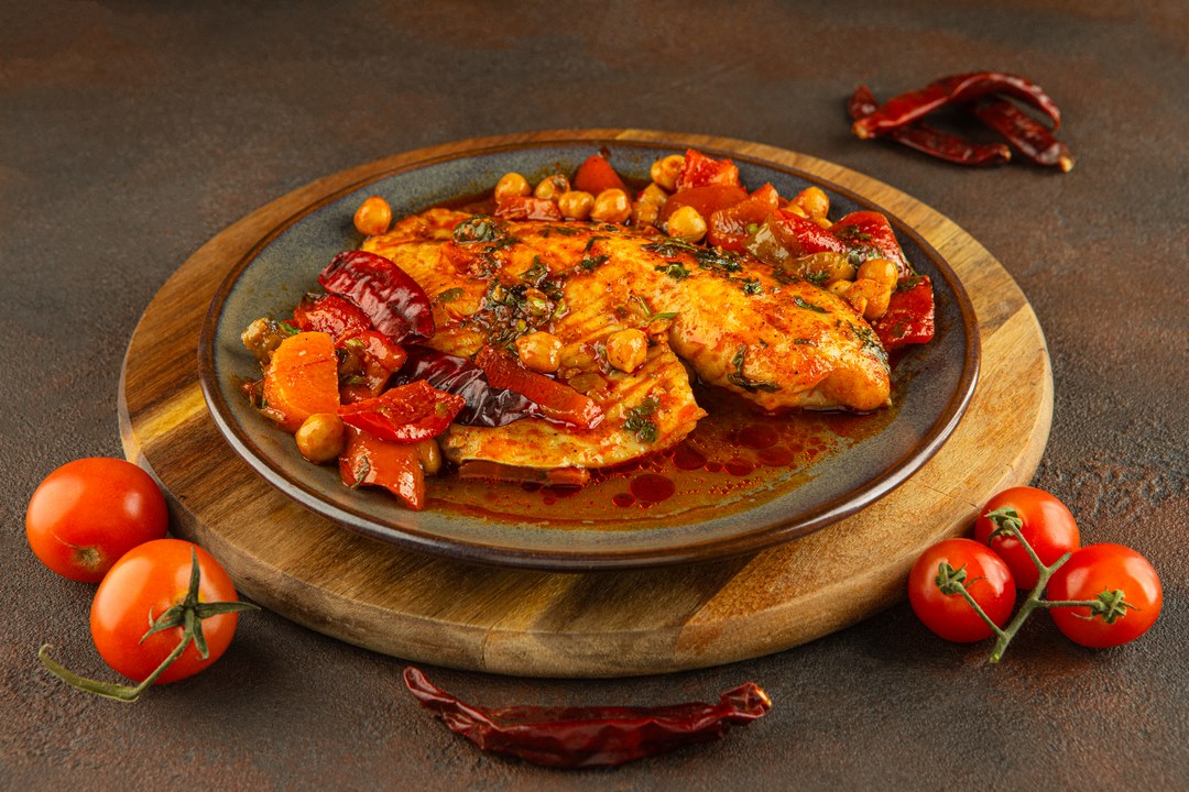 דג מושט רך ברוטב עגבניות חרפרף עם פלפלים ותיבול מסורתי – טעם של בית.